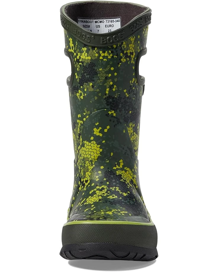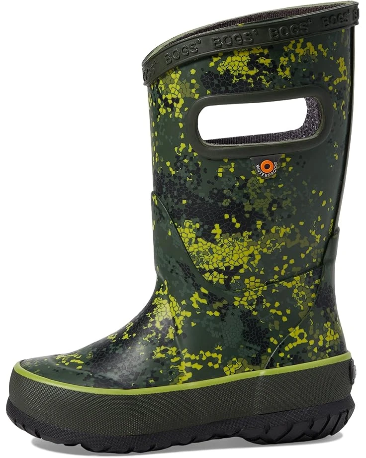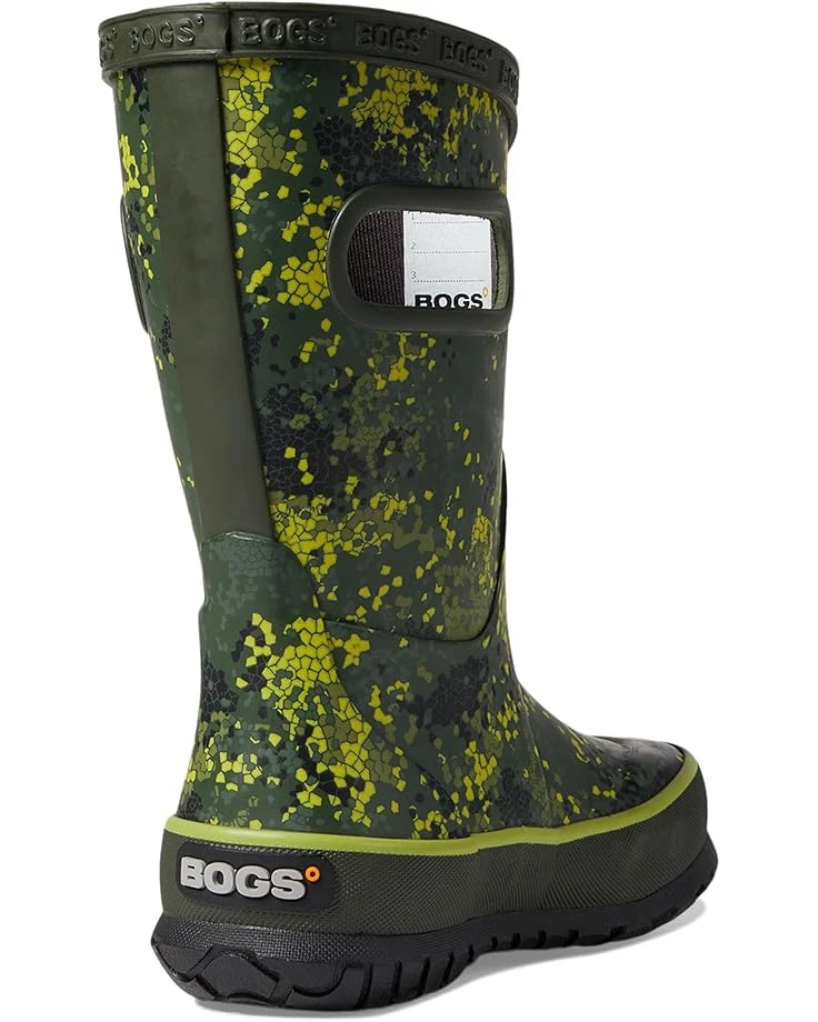 - Dress up your kid to play around in the rain and enjoy the weather to the fullest with the Bogs® Kids Rain Boots Micro Camo boots. The Max-Wick technology of these rain boots keeps your feet dry and sweat-free. These rubber boots come with side handles that offer easy on and off. Featuring lightweight and waterproof construction, these kid’s boots are the perfect choice for outdoor adventures and rides.