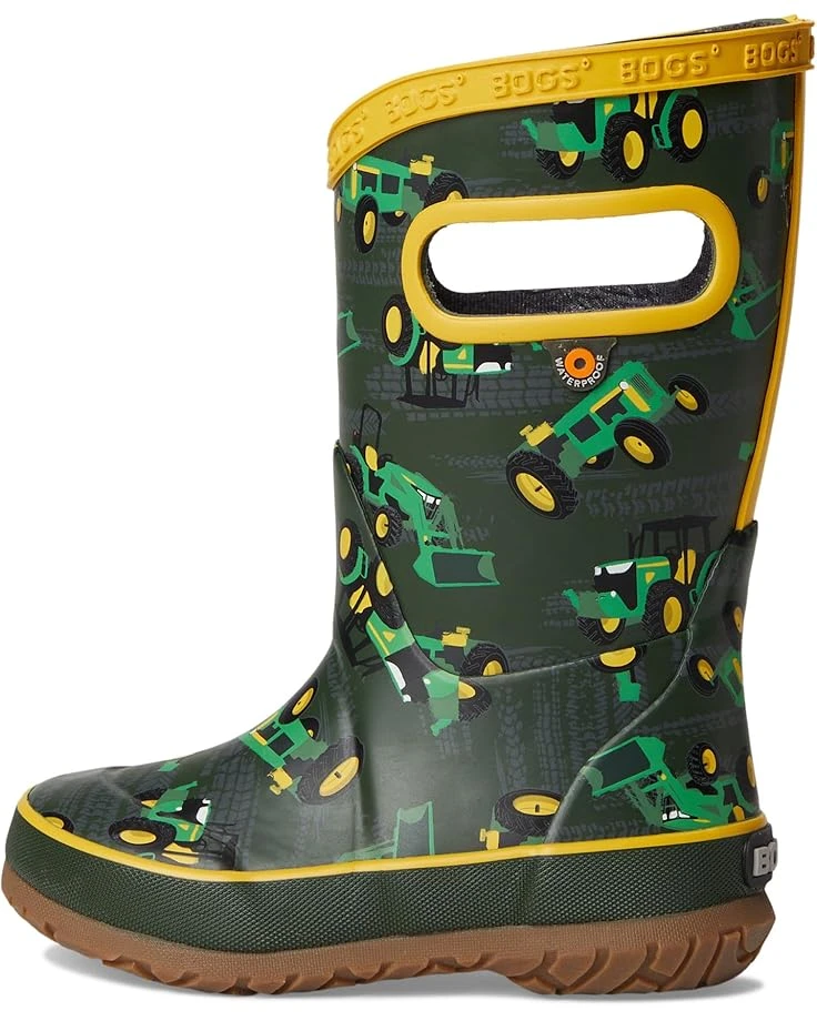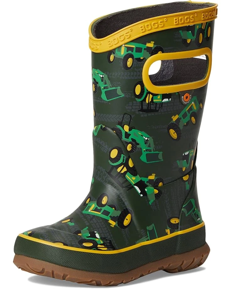 - Let your little one jump into puddles, and stay dry in style wearing the Bogs® Kids Rainboot Tractor. Crafted from rubber upper, fabric lining, and polyurethane insole, this pair of boots features round toe, and slip-on style. The DuraFresh natural bio-technology activates to fight odors, BOGS Max-Wick evaporates sweat to keep feet dry, bio-based footbed provides comfort while minimizing environmental impact, and easy on handles.
